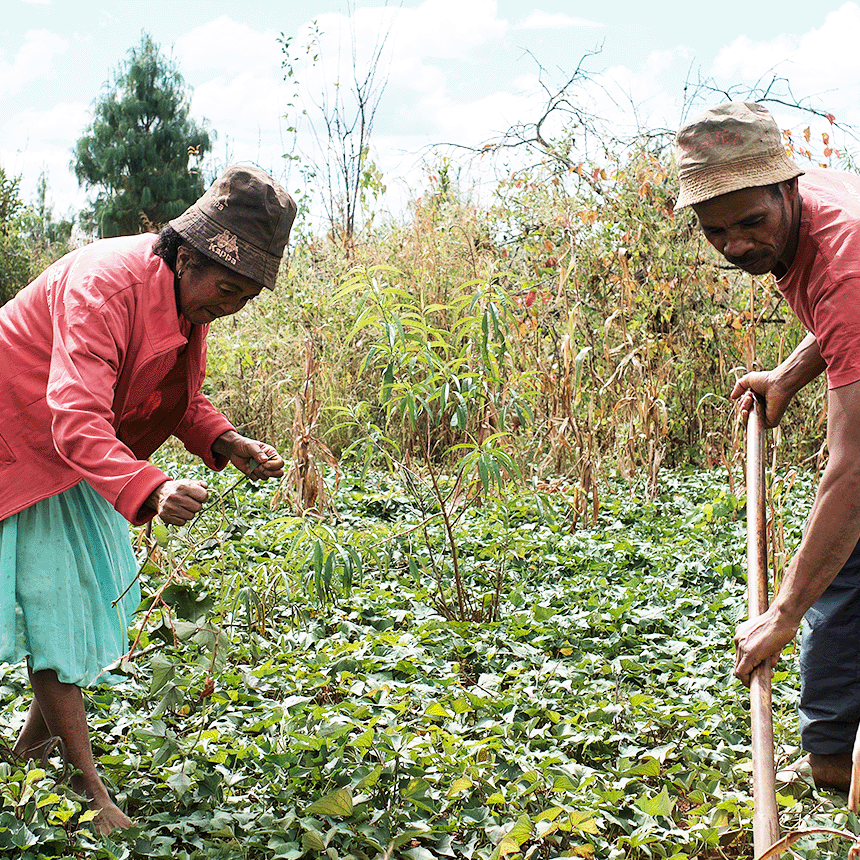 Jean Marie und Elienne Rakotondrahasy bei der Arbeit auf ihrem Süsskartoffelfeld