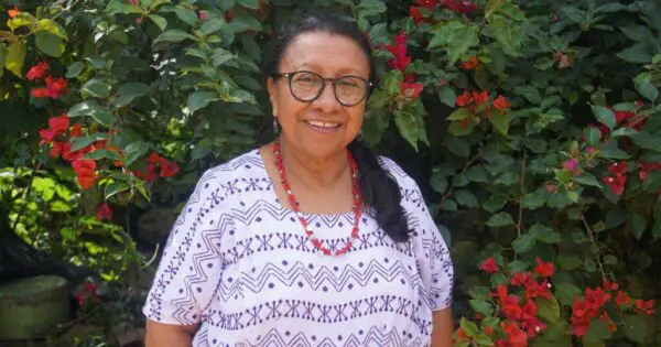 Inés Pérez, Koordinatorin in Guatemala, steht vor einer blühenden Hecke.