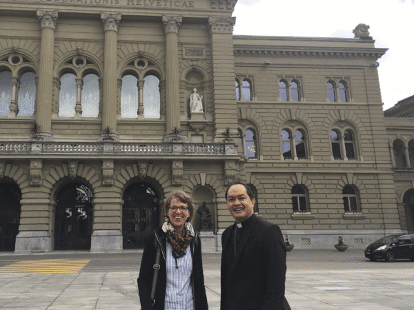 Unsere Philippinen-Verantwortliche Helena Jeppesen steht mit Kardinal David vor dem Bundeshaus. Das Foto entstand 2019 während einer Reise zu den Vereinten Nationen in Genf.