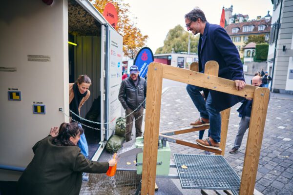 Der Escape-Game-Container war diesen Herbst auch in drei anderen Städten im Einsatz. Auf dem Bundesplatz in Bern lockte er am 9. Oktober rund 150 Zuschauer:innen an. Vielleicht auch, weil zu den Spieler:innen gleich zwei Gruppen von Politiker:innen aus ganz unterschiedlichen Parteien gehörten. Dabei liess sich unter anderem beobachten, wie der Aargauer SVP-Nationalrat Alois Huber im Container einträchtig und konstruktiv mit der Berner Grünen-Nationalrätin Christine Badertscher zusammenarbeitete. Sie erzielten mit ihrem Vierer-Team am Ende sogar mehr Punkte als die zweite Polit-Gruppe mit SP- und Mitte-Vertreter:innen.