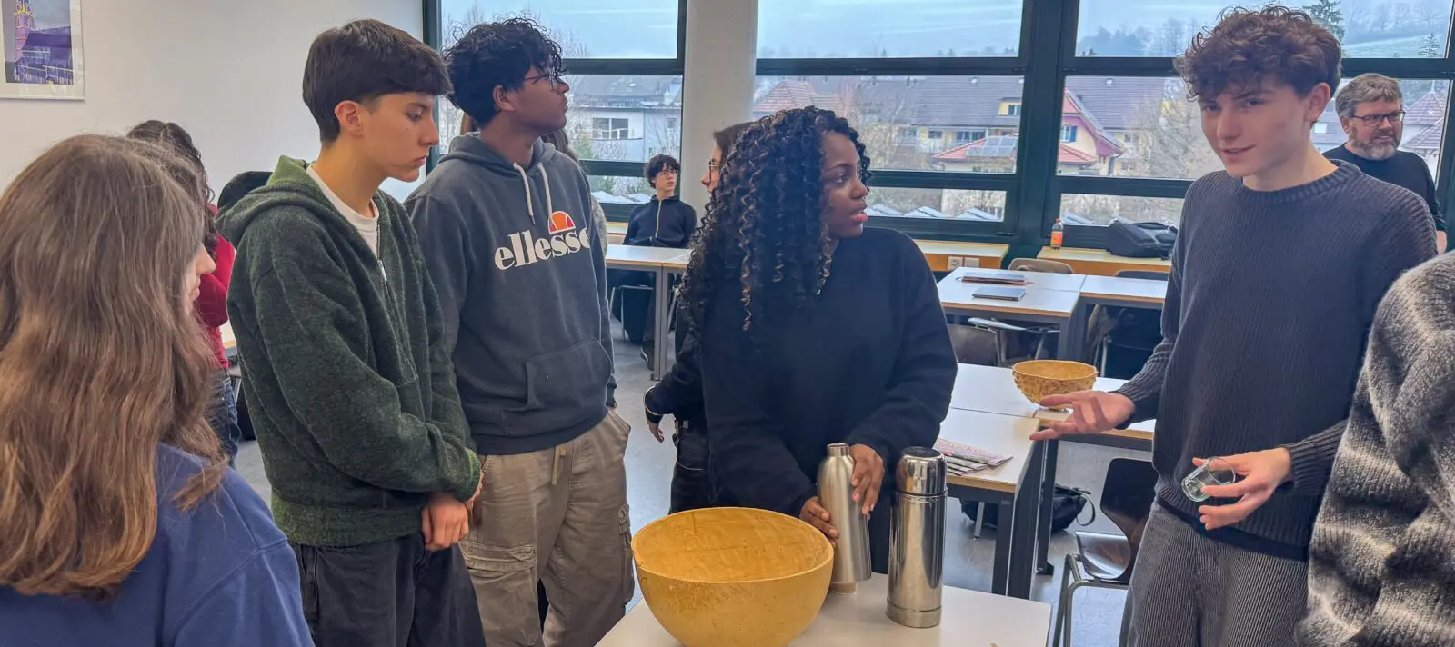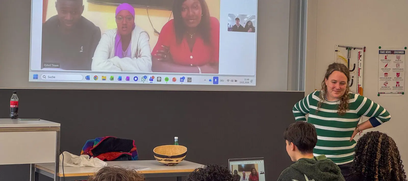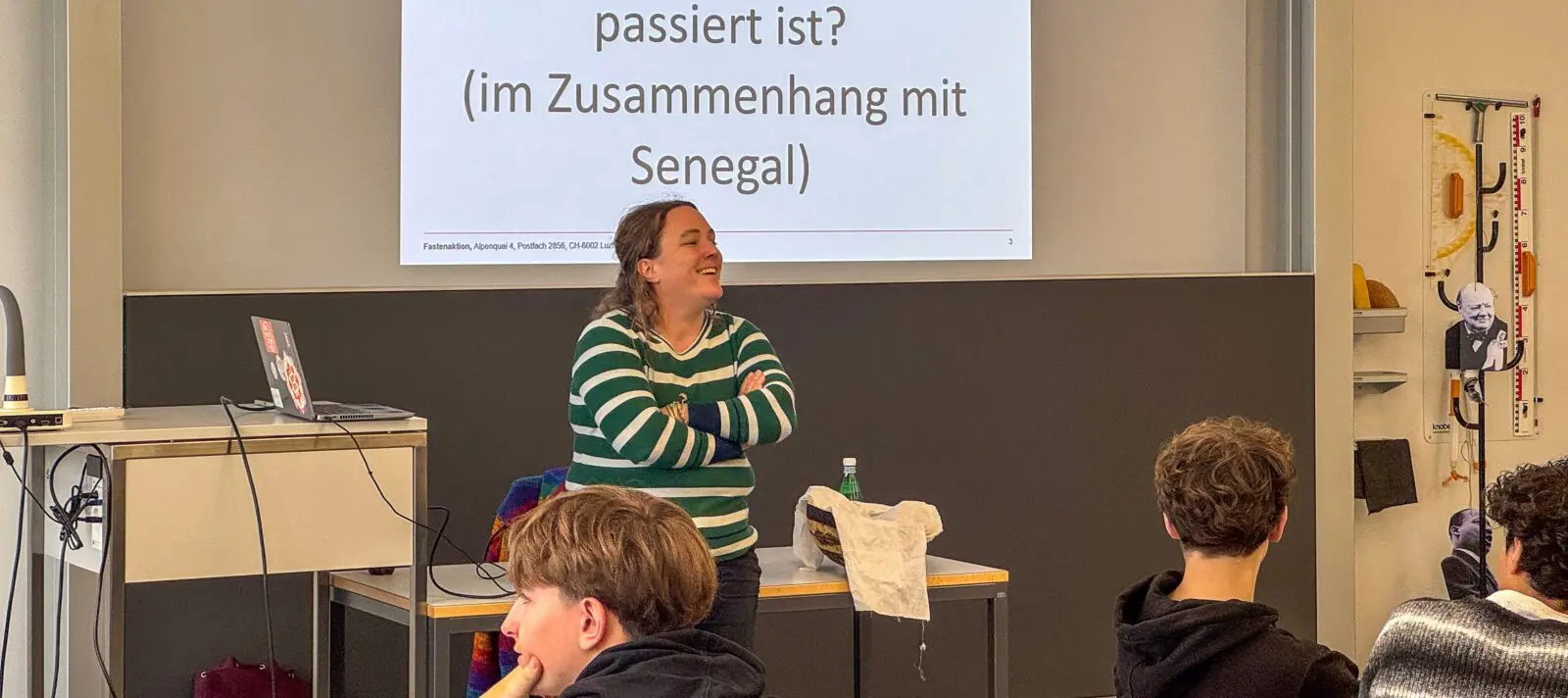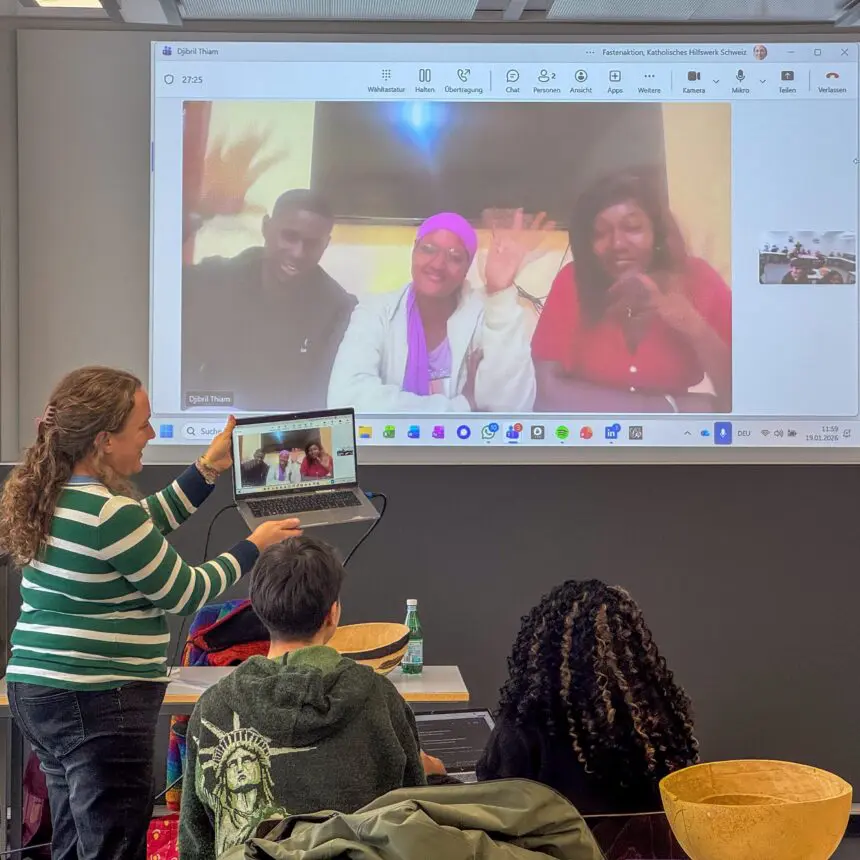 Für die etwa 30 Schüler:innen im Alter von 15 bis 17 Jahren kommt diese Doppellektion am Ende einer längeren Phase, in der sie sich im Akzentfach Gesellschaftswissenschaften mit Entwicklung in Westafrika beschäftigt haben. Das Akzentfach umfasst Geografie, Geschichte und Wirtschaft, und die Jugendlichen kommen dafür aus mehreren Klassen zusammen. Vor dem Online-Call erfahren sie von Vreni Jean-Richard noch einiges über den Senegal, über die teils problematischen Wirtschaftsbeziehungen der Schweiz zu den Ländern des Globalen Südens sowie die konkrete Arbeit von Fastenaktion – etwa wie die enorm erfolgreichen Solidaritätsgruppen im Senegal funktionieren. Und in der Pause gibt es einen typischen senegalesischen Tee, der gut anzukommen scheint.
